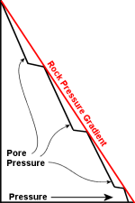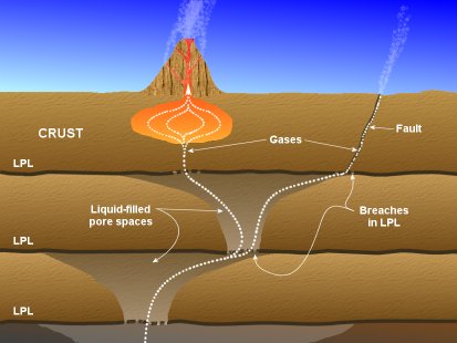 Figure 2. Domains of fluid-filled pores in a vertical series of pressure regimes. Low permeability layers (LPLs) retain domains of higher permeability below. Over time, upward migrating fluids may exert enough pressure to breach an LPL, eventually reaching the surface (as gas) and perhaps engendering earthquakes along the way. LPLs and other rocks are fractured by rising fluid, and then ultimately gas, pressures in the uppermost mantle and crust.