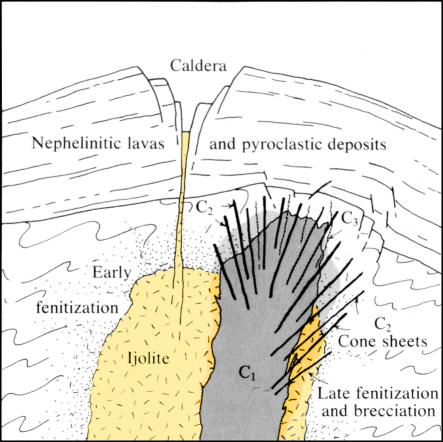 | Idealized spatial relationships for a hypothetical carbonatite-nephelinite association as encountered in eastern Africa. Intrusion of ijolite magma produces fenitization of wall rocks and erupting magma builds a volcanic cone of nephlinite, which then undergoes a caldera collapse. C1 = carbonatite magma; C2 = a swarm of late-stage carbonatite cone sheets; C3 = late-stage carbonatite dikes. [After M.G. Best, 1982, Igneous and Metamorphic Petrology; Fig. 6-3. (Freeman and Co., San Francisco).] |