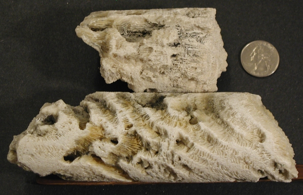 After our field work, we noted a large piece of coral at a depth of 45 ft in core-hole 2. (See Fig. 9). This was identified by two university geobiologists as Colpophillia breviserialis, a type of brain coral found in the Bahamas during the late-Pliocene to early-Pleistocene. Another sample in core 2, at the 48-to-49.5 ft depth below MSL, contained rudstone, an indurated carbonate mud with shell fragments of Turritella type gastropods 15%, worm shells 10%, ribbed bivalves 15%, and non-ribbed bivalves 60%. (See Fig. 10). Associated with this assemblage was Montastrea I-franski, a type of boulder coral found in the Bahamas during the early to mid-Pleistocene. (See Fig. 11).