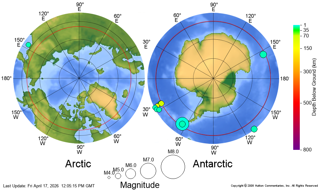 This graphic shows the locations, magnitudes, and depths of all earthquakes of M4.0 or greater occurring within (or near to) the boundaries of the arctic and antarctic regions during the last 30 days. The red circles on the two maps define The Hutton Commentaries’ boundaries for the arctic (+63°N Lat.) and the antarctic (-60°S Lat.) regions. The graphic is updated daily.