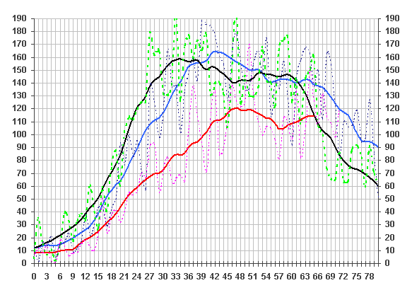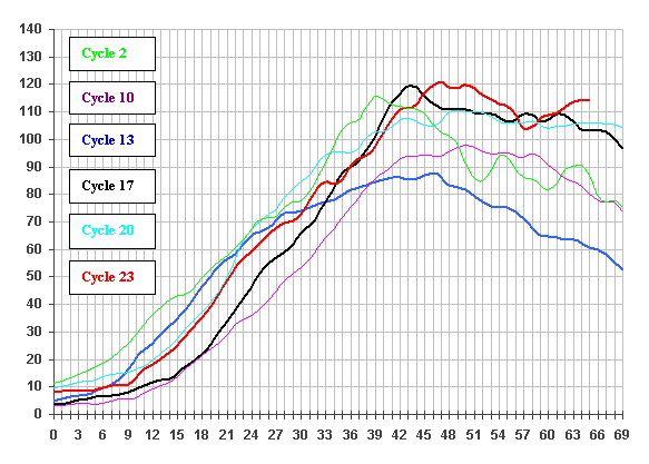 The word paramount implies "one superior to all others with which we are familiar." Now let's turn to the latest information on the progression of the current solar cycle to see if there is any evidence that it may become paramount. J. Alvestad's latest graph, of sunspot frequencies for solar cycles 2, 10, 13, 17, 20, and 23 (shown below) shows high promise that cycle 23 may indeed be becoming paramount.