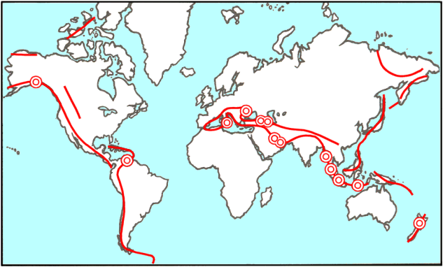 Fig. 3. Geologically young fold or fault belts. (See red lines). The most prominent mud volcano fields (double circles) all fall on these belts. After Gold, Fig. 8.4Gold points out that the largest mud volcano region lies on the shores of the Caspian Sea and that these volcanoes closely follow the fault lines in the basement rock. They emit mostly methane, while lava volcanoes emit mostly water vapor and carbon dioxide. He concludes (1987, p. 103) that,