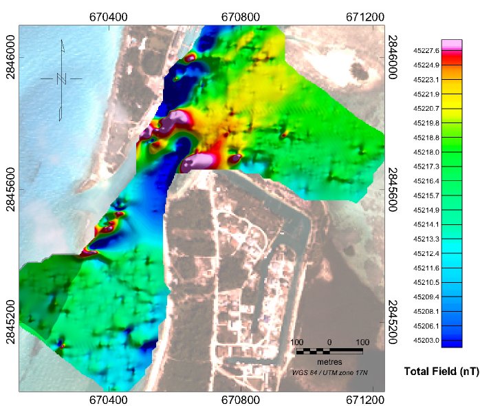 Fig. 5. Total field magnetic map for the inlet area. The change in magnetic intensity across the survey area is about 25 nT. Areas of high magnetic intensity (darkest red and pink) at NW end of inlet are possibly due to ferrous (iron) targets or perhaps outcrops of the mineralized vein. Several smaller ferro-metallic iron targets may also be indicated by localized magnetic highs. We interpret the northeast-southwest trending yellow zone to be the signature of the buried mineralized vein. Note the northeast-southwest trending yellow pattern along the eastern side of the inlet channel. This is interpreted to reflect the mineralized zone of reading 996-12. The magnetic trend extends to the southwest. It then runs beneath the northwestern point of South Bimini. We explained the hypothetical mineralized zone as being a weakly-magnetic body with just enough iron-rich hematite (Fe2O3), or other iron material, to allow distinction of the mineralized vein from the surrounding, relatively more iron-poor, carbonate sedimentary rock.