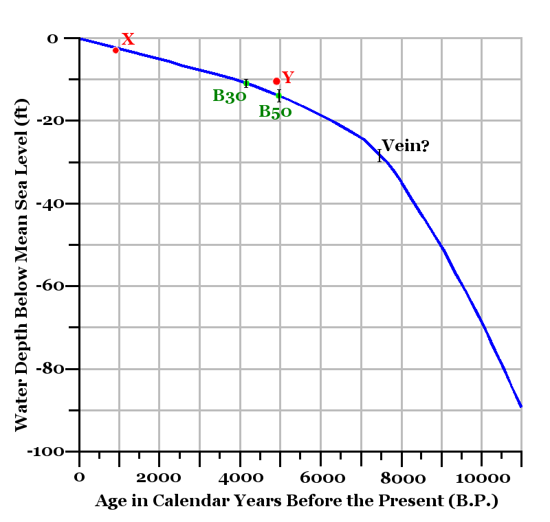 The approximate ages of samples B30 (4,100 B.P.), B50 (5,000 B.P.), and the time of submergence of the mineralized vein (7,500 B.P.) are inferred from their respective positions relative to this curve of sea-level rise. See discussion later in the text.