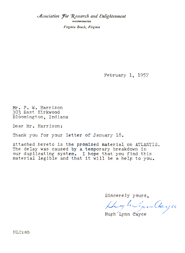 W. Harrison's personal search for Atlantis began with the Edgar Cayce readings supplied to him by Cayce's eldest son, Hugh Lynn, in 1957.